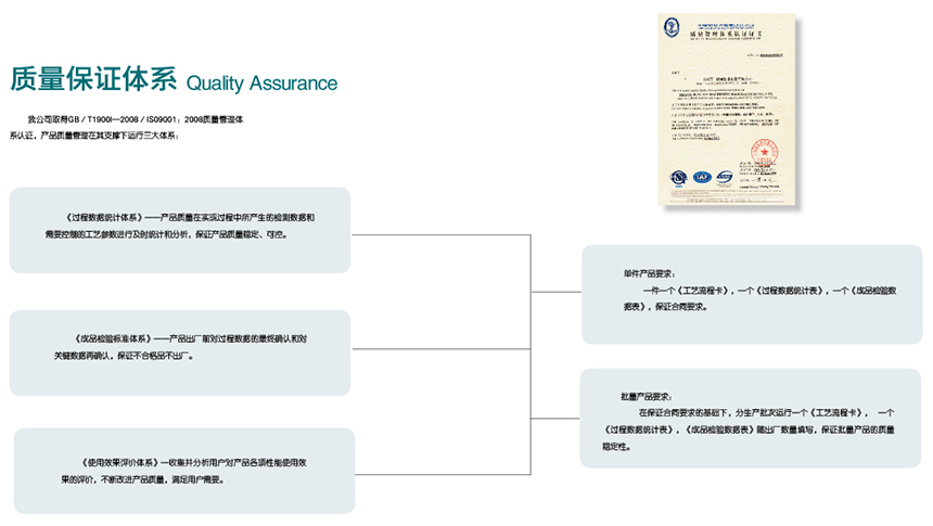 我公司取得GB/T1900I-2008/IS09001:2008質(zhì)量管理體系認證,產(chǎn)品質(zhì)量管理在其支撐下運行三大體系: